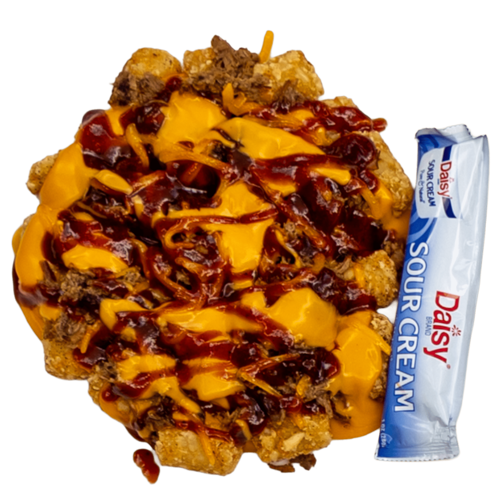 Tater tots covered with Yachties queso, cheddar cheese, sour cream, drizzle of Yachties BBQ, and a choice of **protein**